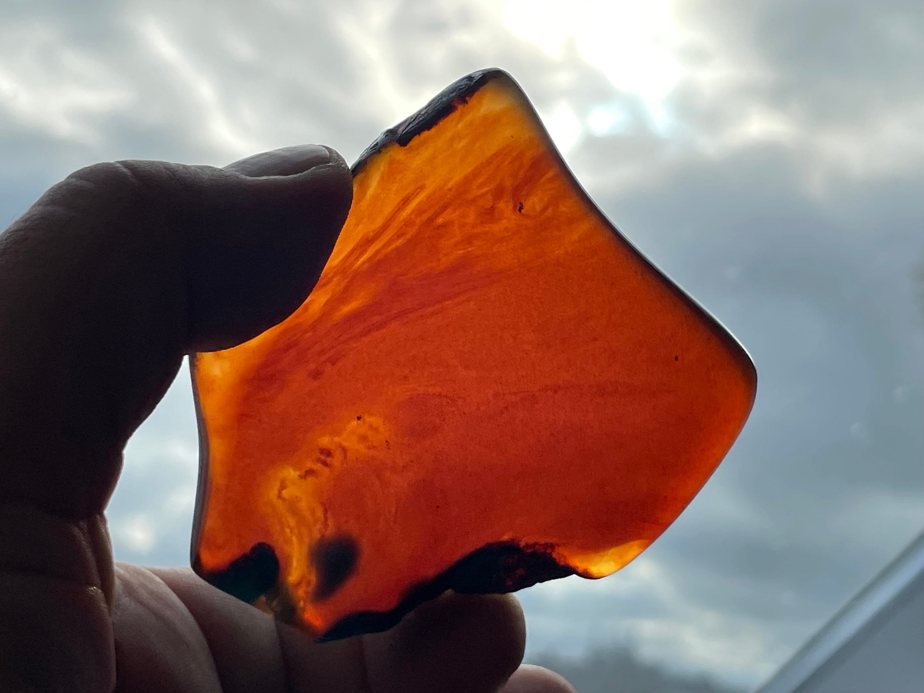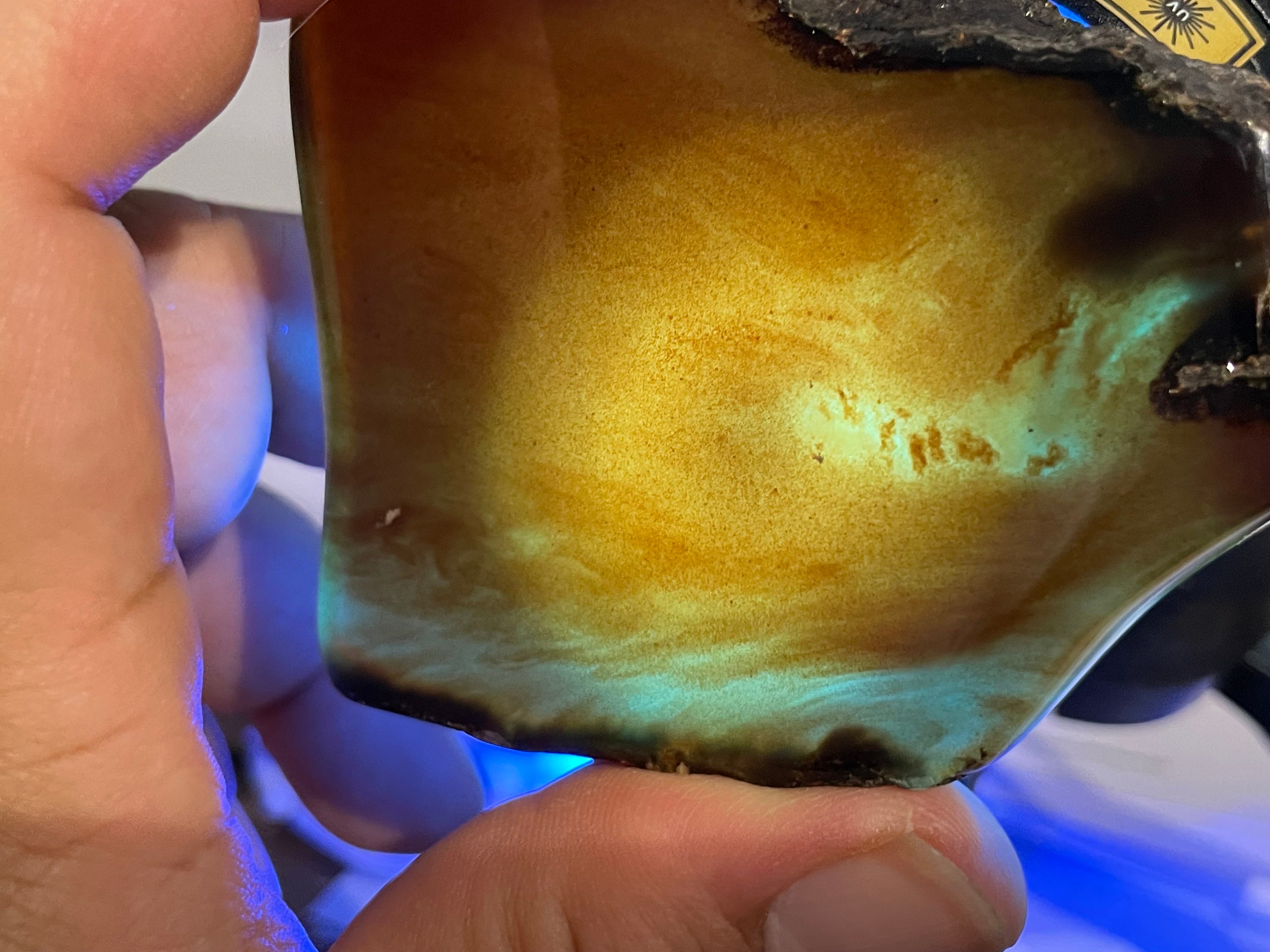 When held up to the sun it appears like ordinary amber, and under ultraviolet light (use a UV lamp) it glows a bright milky blue.