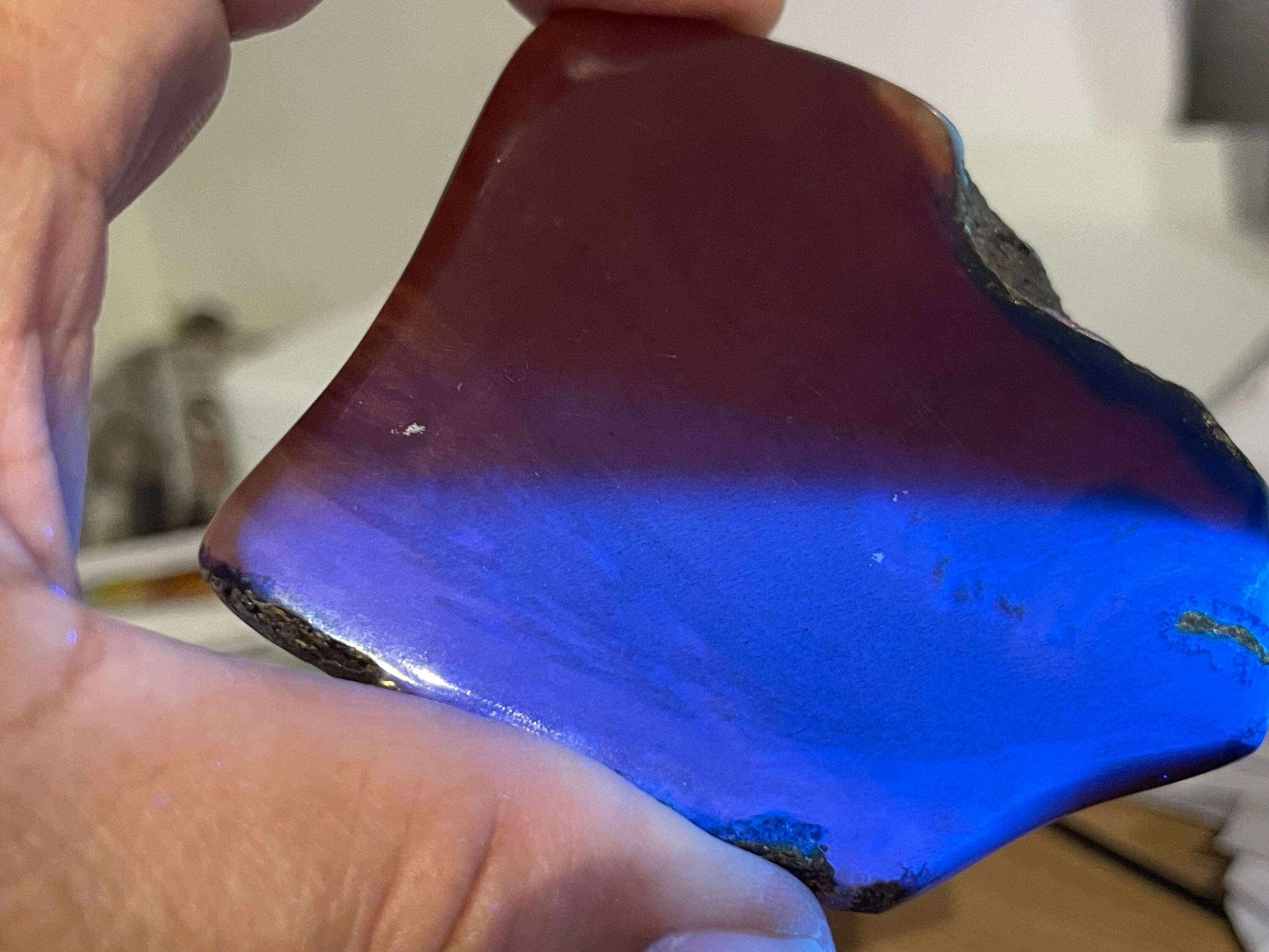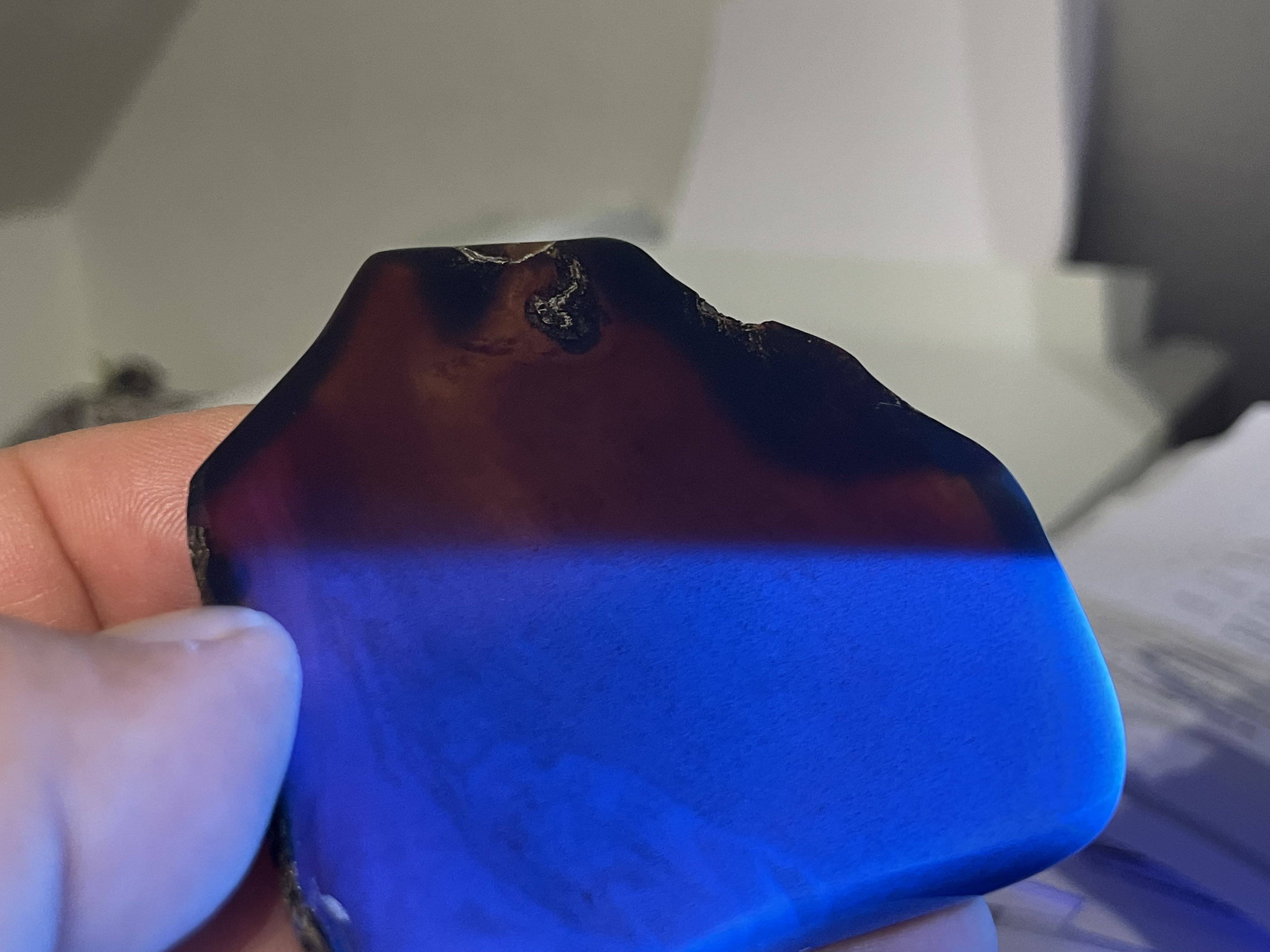 That's what makes him so rare. Amber does not mean that it glows blue, but under artificial light the amber appears like ordinary amber, but under sunlight it has an intense fluorescent blue glow.