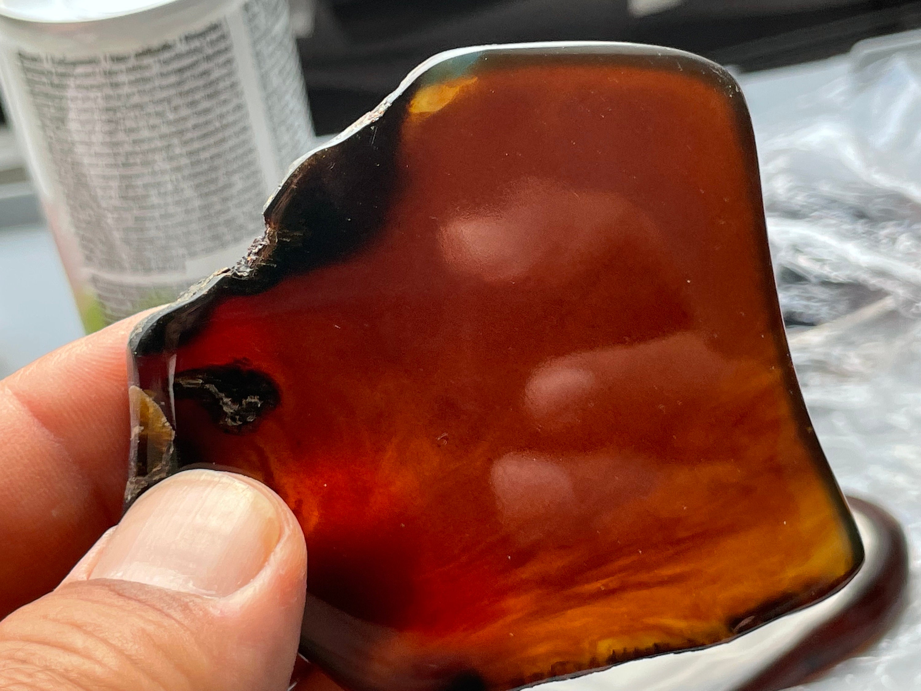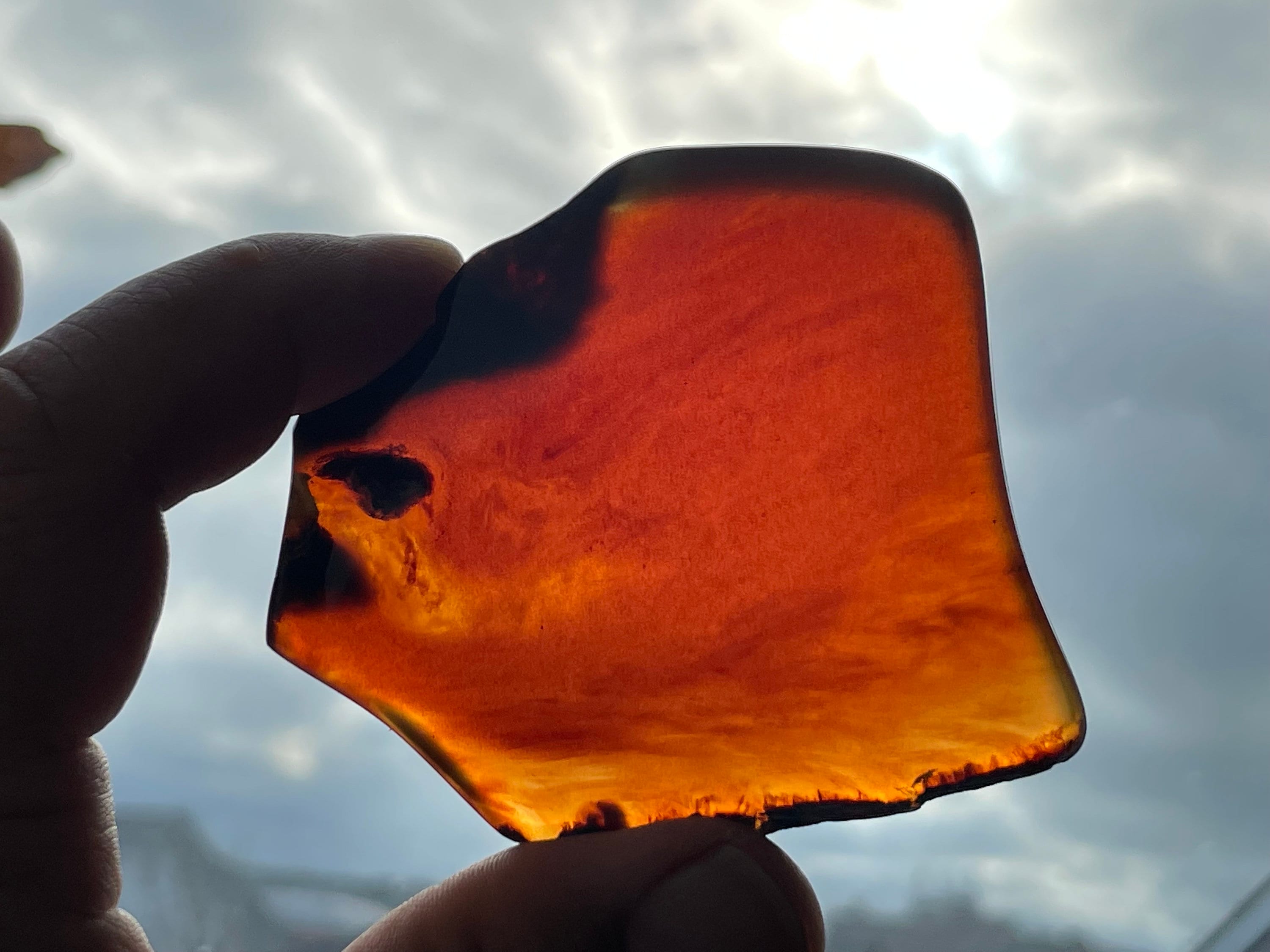If you look at the amber in reflected light it is blue, but if you look through the amber it looks cherry red, orange yellow, green or turquoise.
