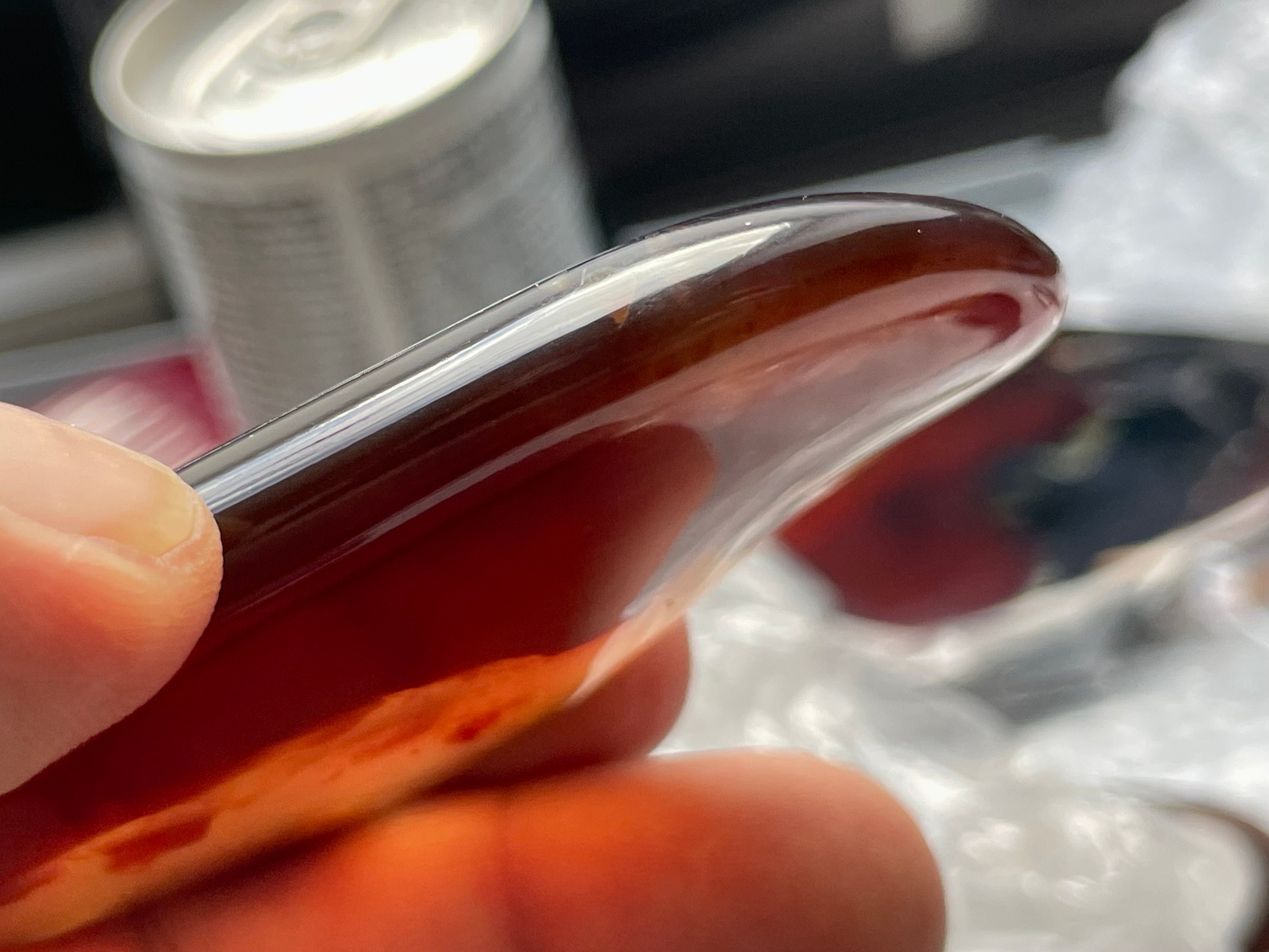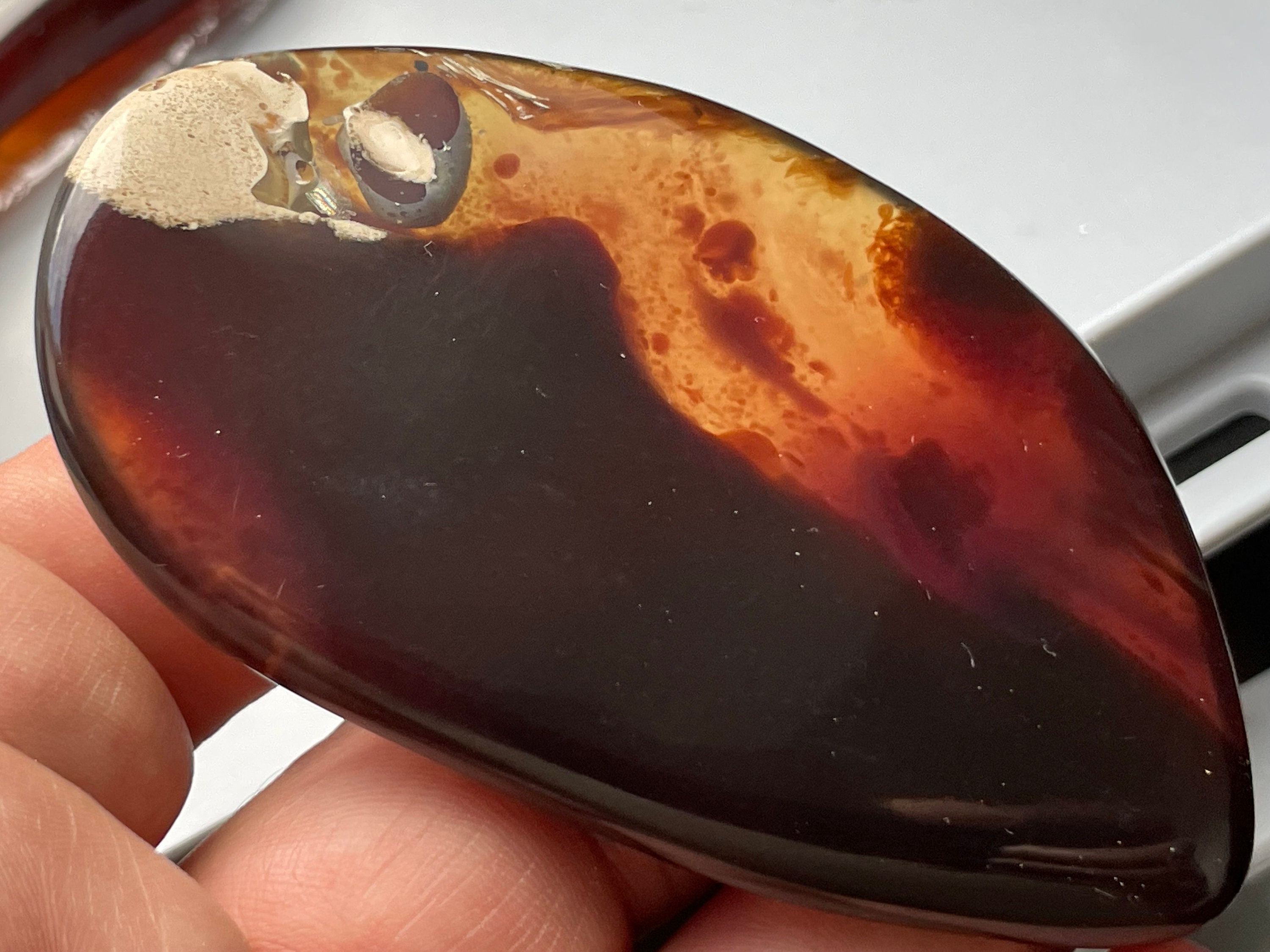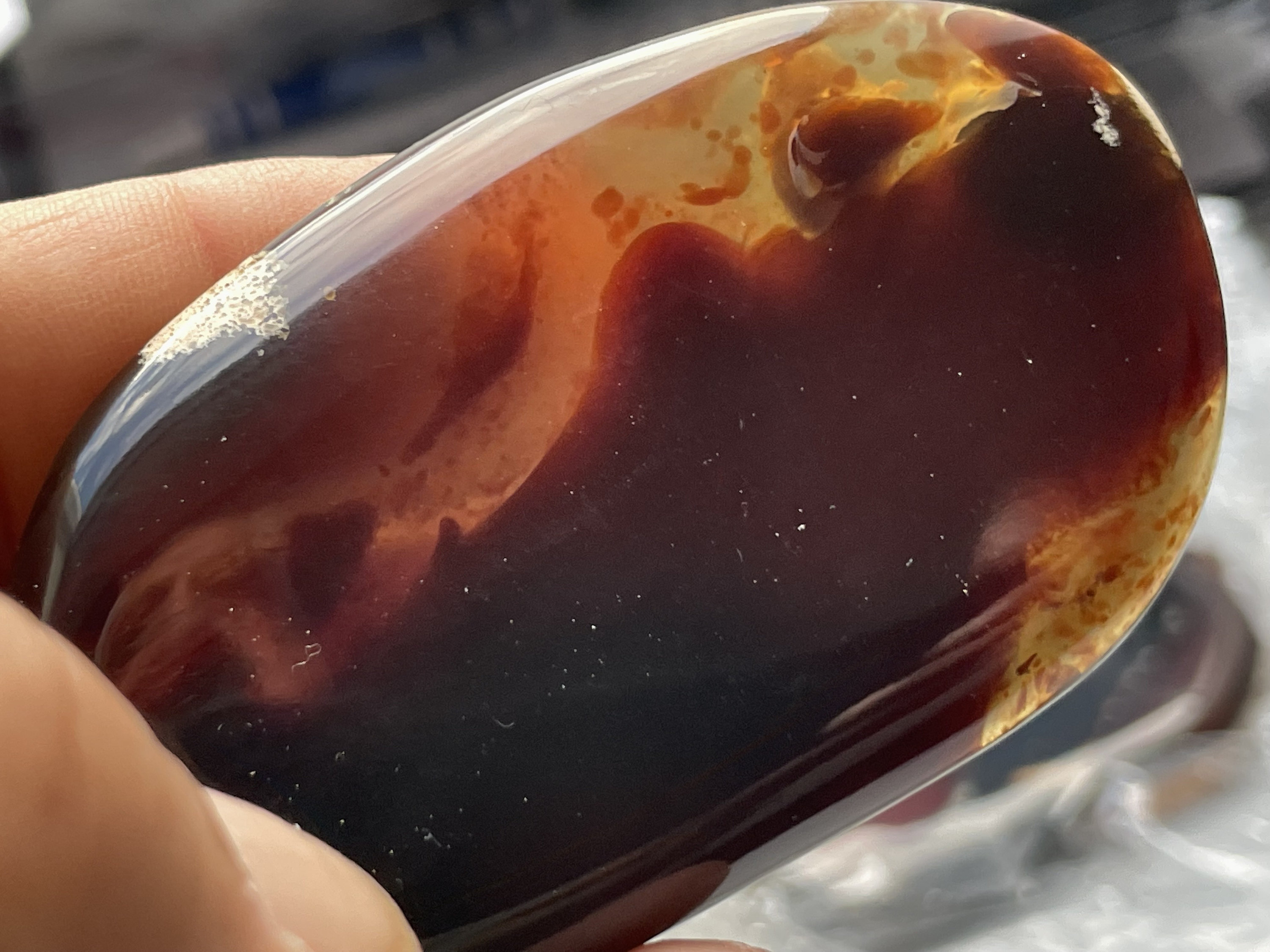 Depending on the incidence of light, blue, red, yellow and orange appear. It varies and shines in its different colors. It is important for the viewer to discover all the play of colors depending on the incidence of light and the density of the amber. It is fluorescent under UV light.