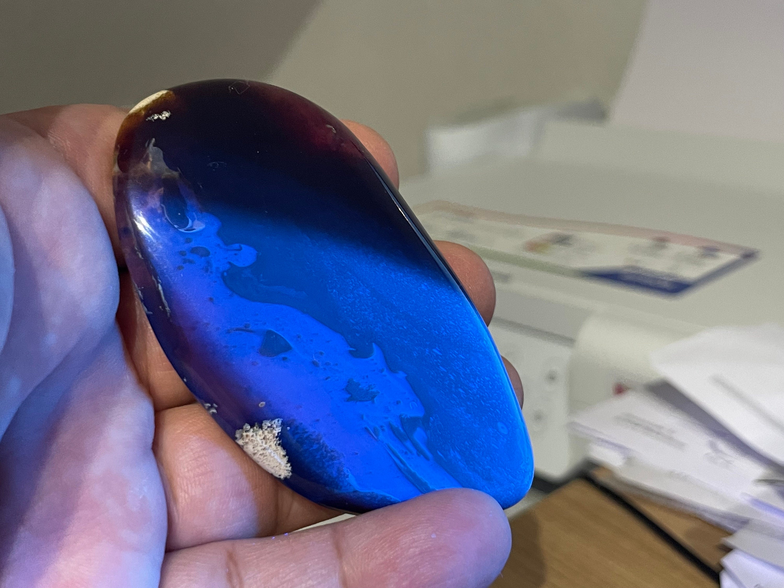 This effect can be likened to the ocean which, although transparent, can appear anything from light blue to dark blue to black depending on depth, mass and salinity. The blue amber is so beautiful and mystical because of its changing colors.