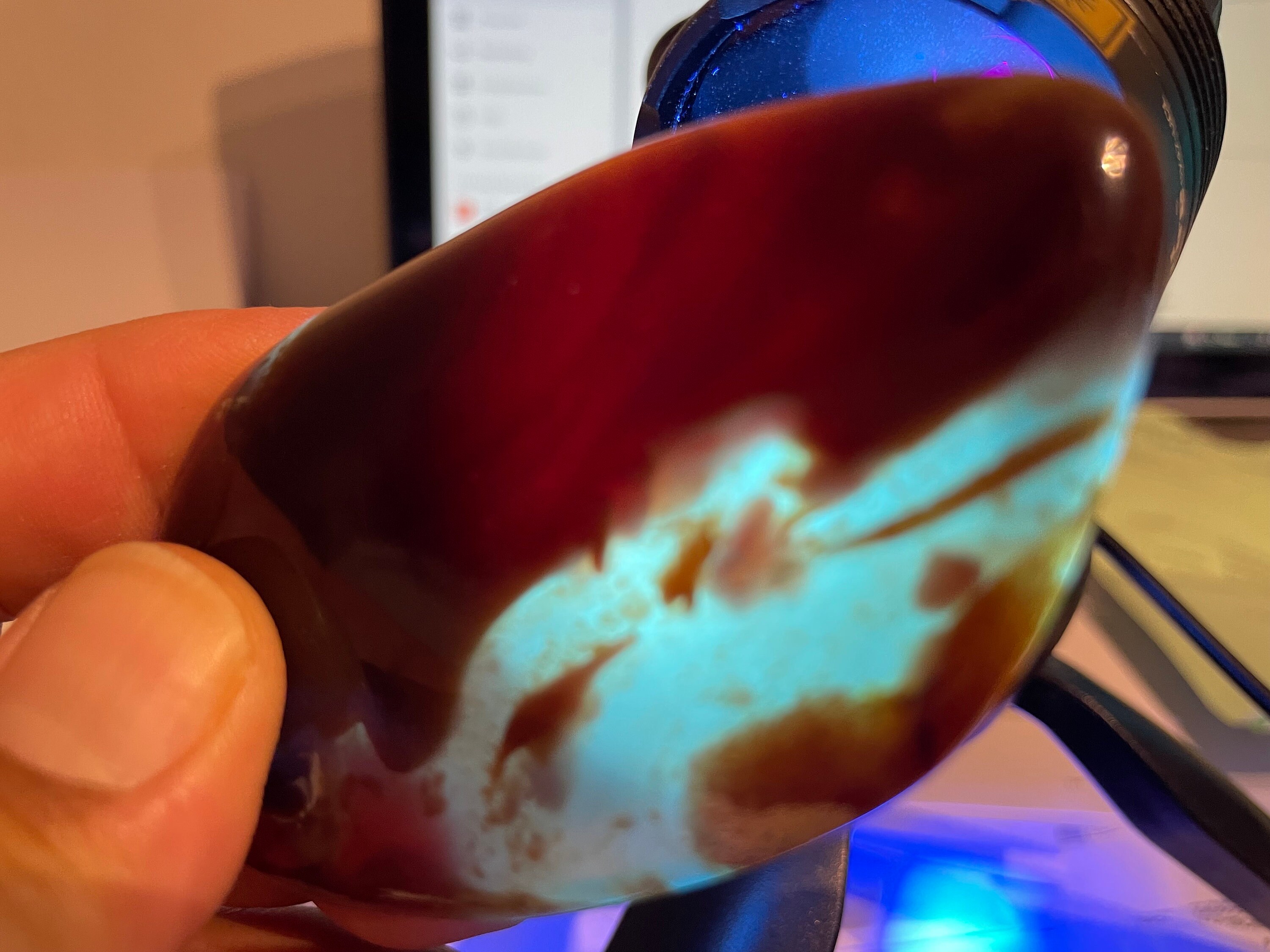 When held up to the sun it appears like ordinary amber, and under ultraviolet light (use a UV lamp) it glows a bright milky blue.