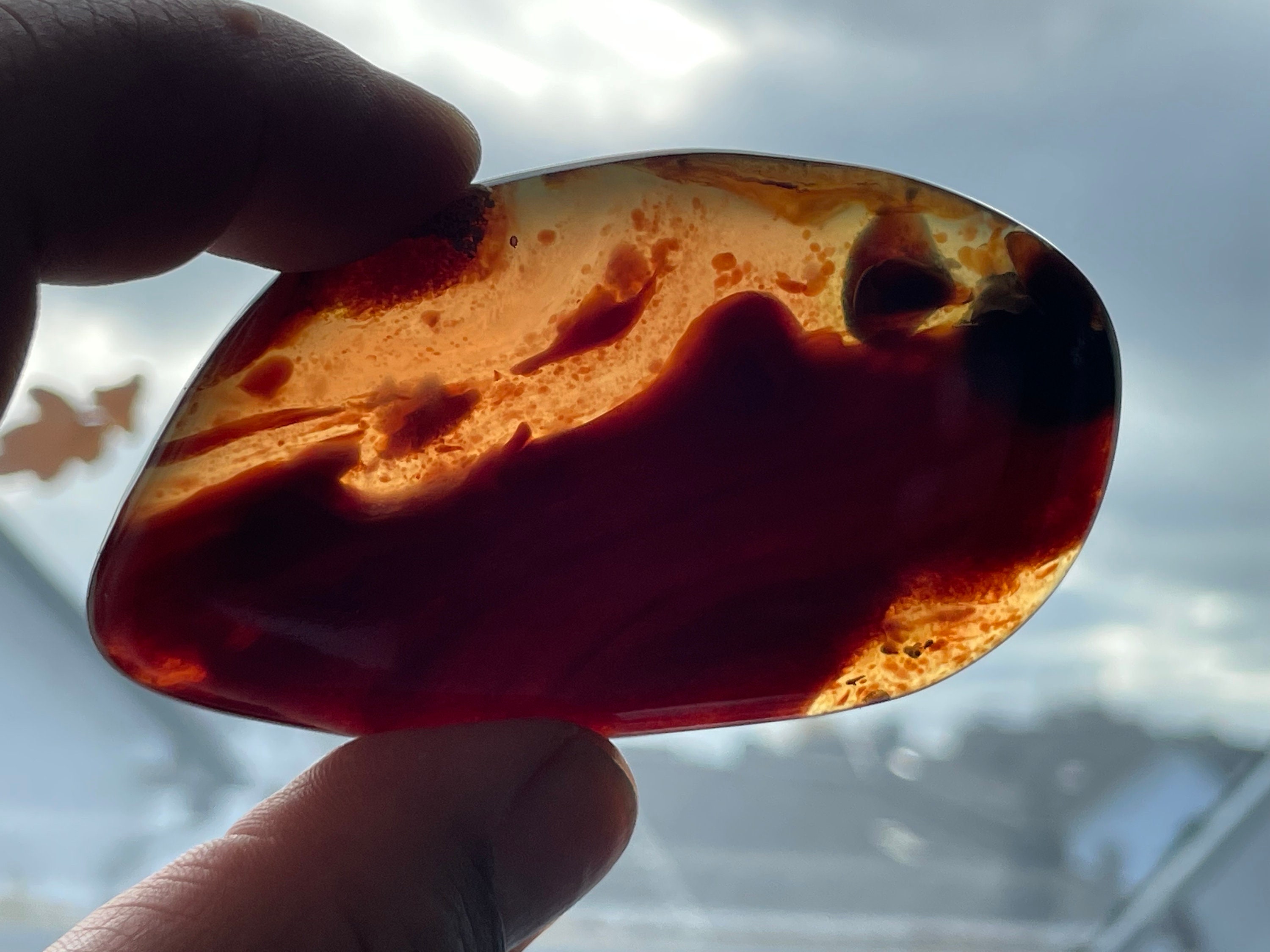 If you look at the amber in reflected light it is blue, but if you look through the amber it looks cherry red, orange yellow, green or turquoise.